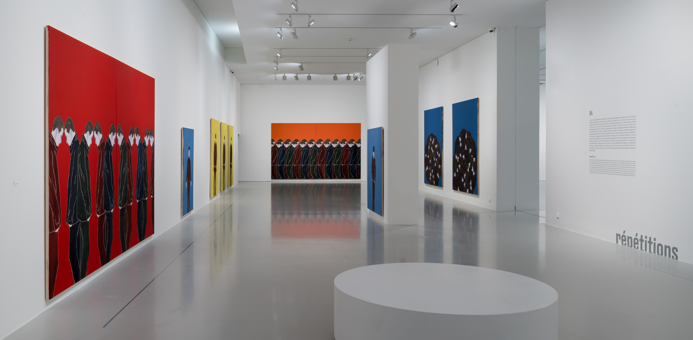 Djamel Tatah explore depuis plus de trente ans une représentation de la condition humaine prise dans la violence du monde. Marcheurs, gisants, penseurs, témoins sont les motifs d’un travail qui se déploie autour de la guerre, de l’exil et de la solitude. Il peint « des gens sans rivage, sans limite, sans couleur, des apatrides, des non enracinés, des anges » (Frantz Fanon). Sur les tableaux accrochés à hauteur d’homme, des figures humaines grandeur nature habitent des aplats de couleurs, espaces indéfinis, sans ornement ni décor. Plongées dans le silence, elles affirment la présence singulière d'une humanité qui résiste à sa destruction et invitent le regardeur à entrer en scène. Abstraits et figurals, les tableaux de Djamel Tatah composent une chorégraphie des corps où la répétition et la variation des formes s’imposent comme une expérience dans la peinture.